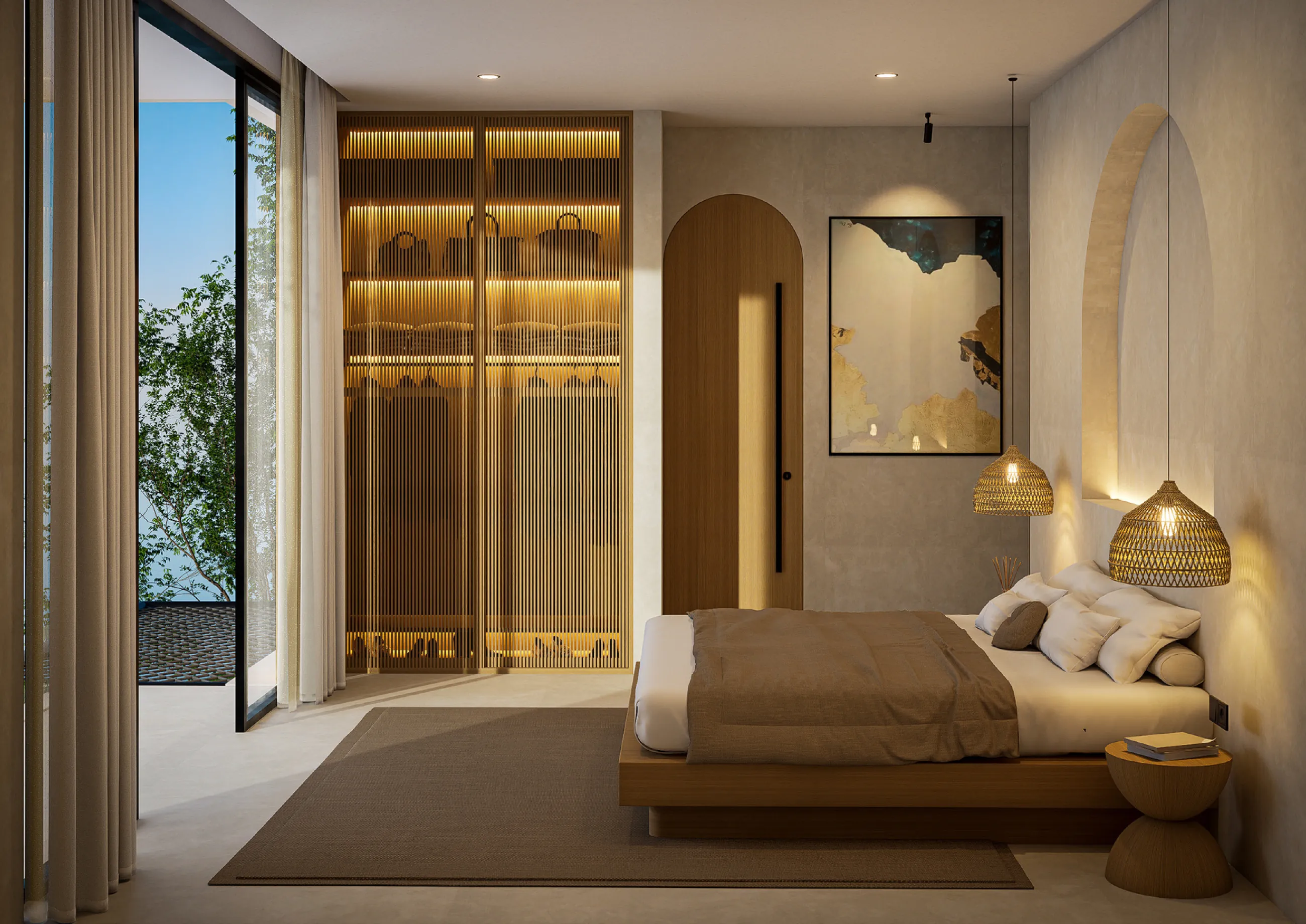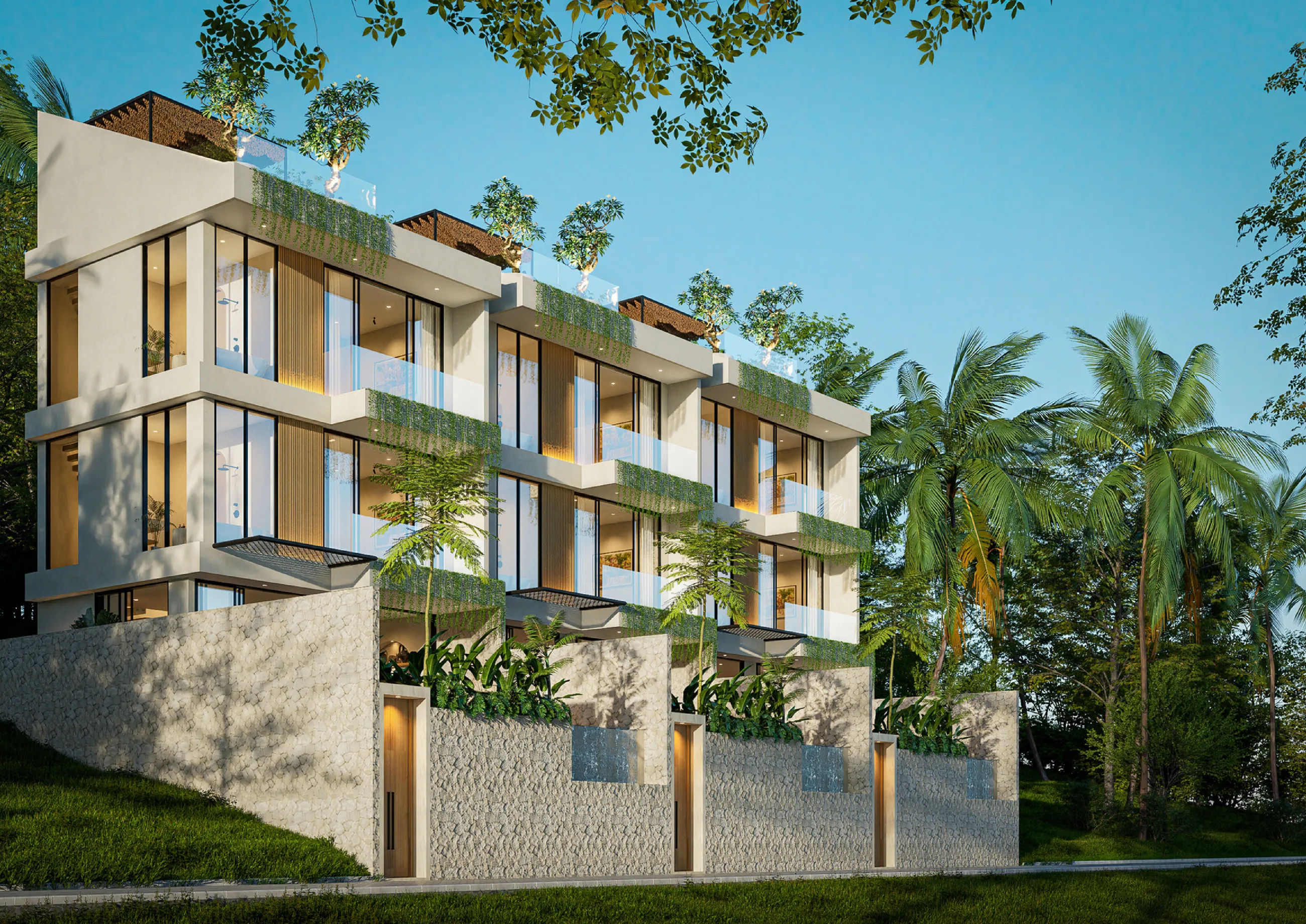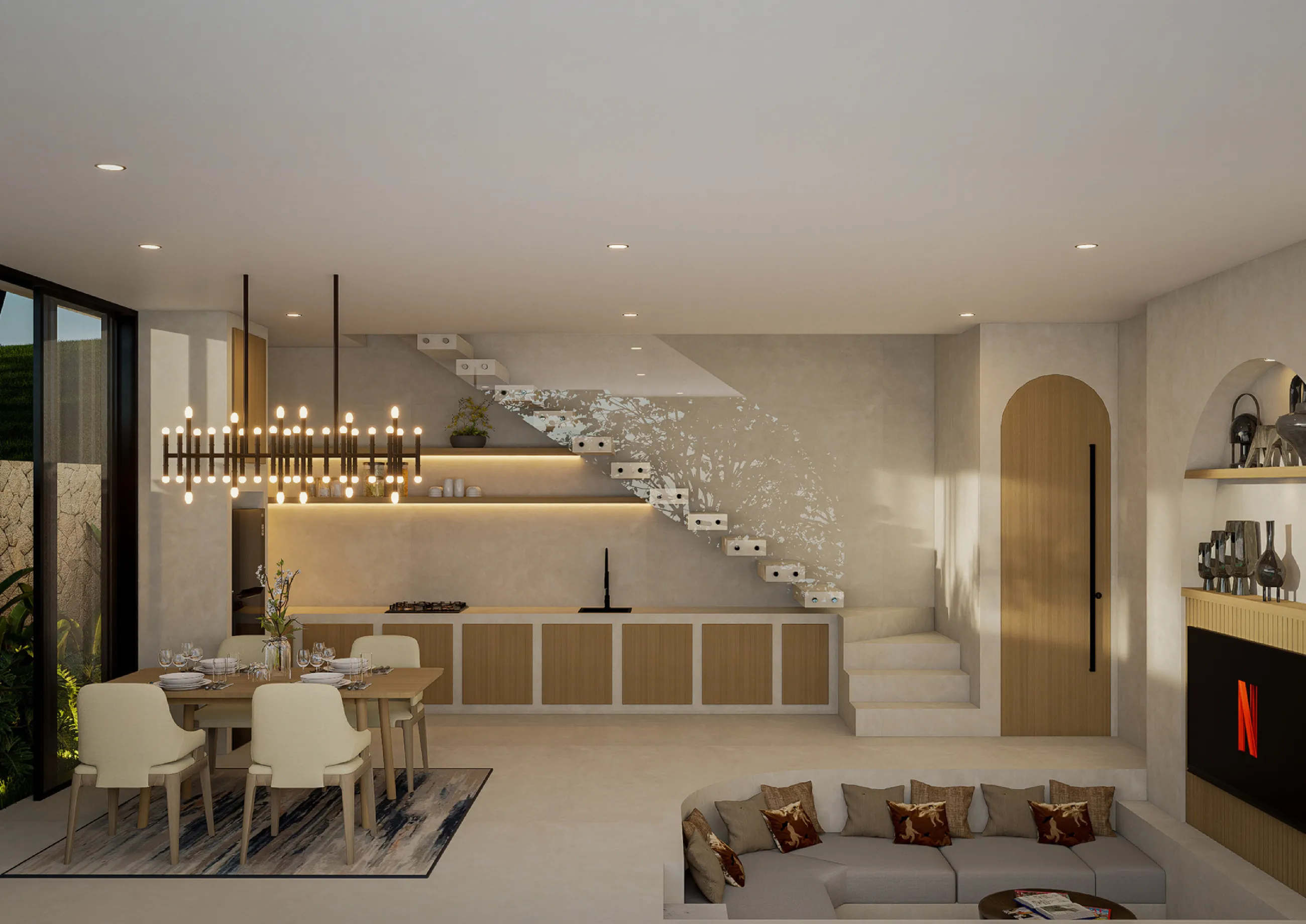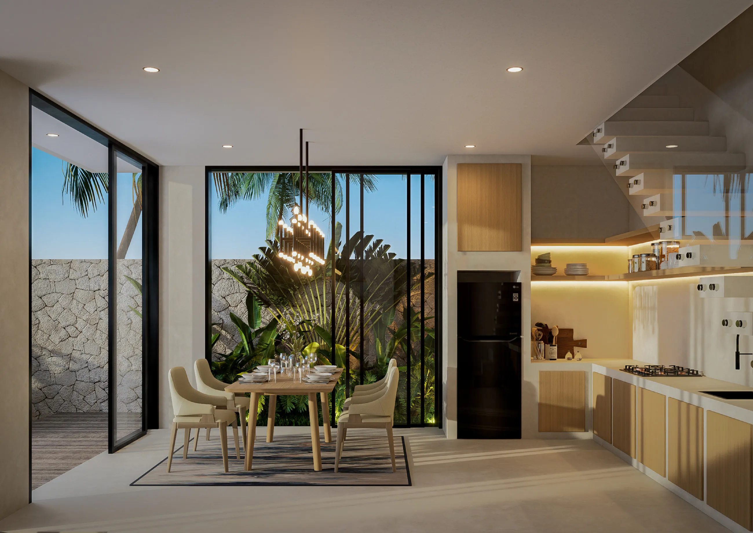 Spread across three levels plus a rooftop terrace, the villa features clean architectural lines by Elden Architect, premium natural materials, and a seamless indoor-outdoor flow. The rooftop offers partial ocean views framed by the jungle, while the main floor opens to a tranquil private pool and landscaped gardens.